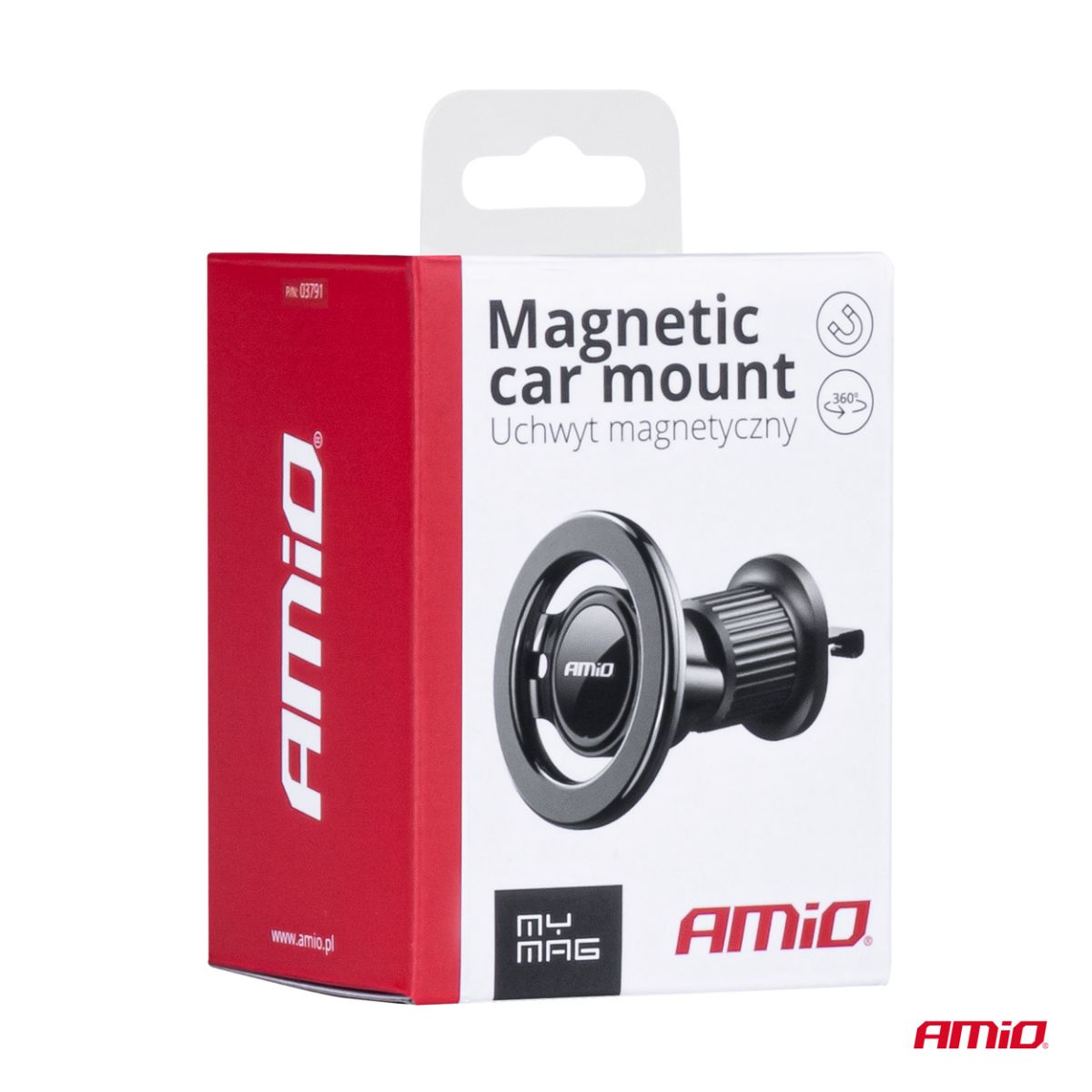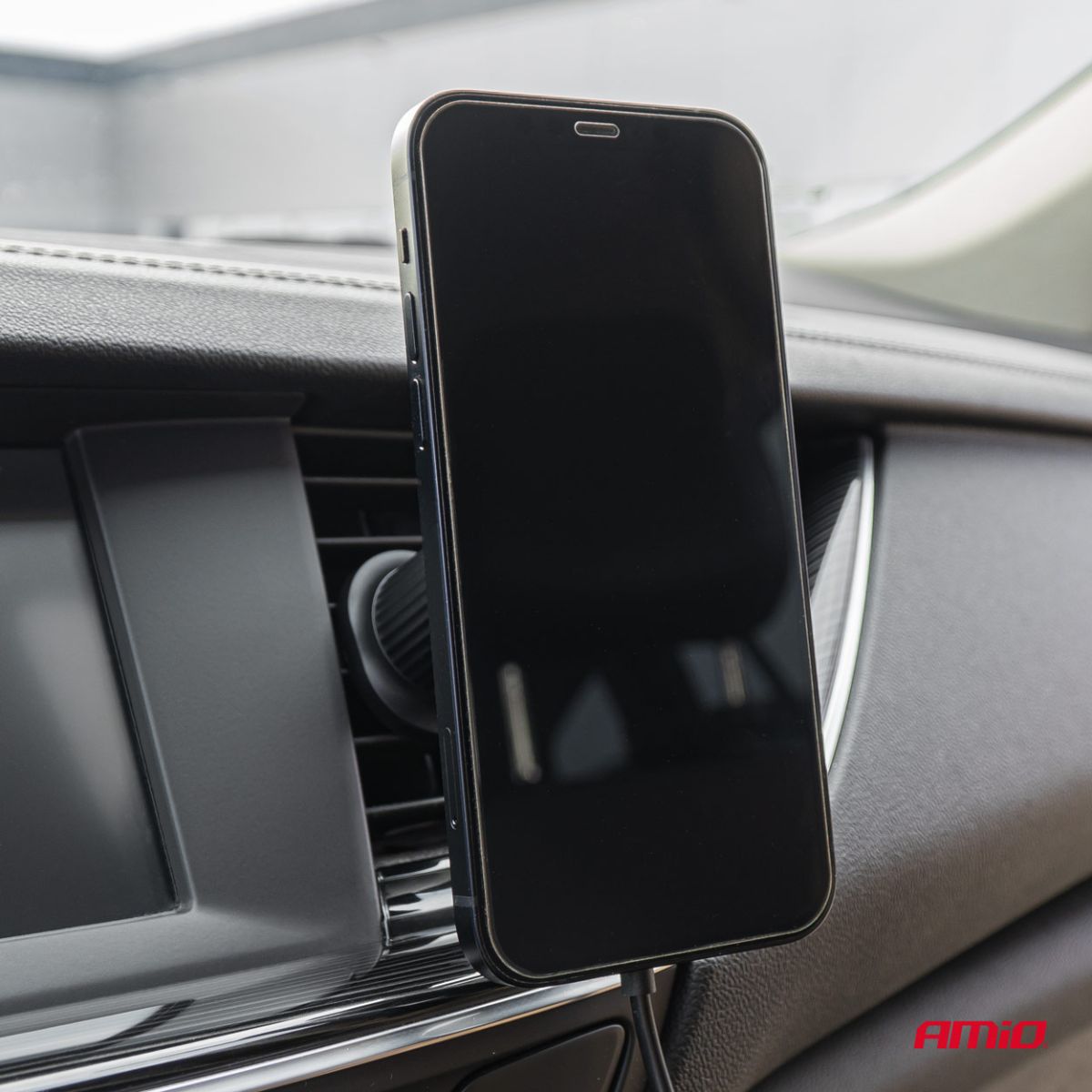 Innovative and elegant mount AMiO My Mag series compatible with MagSafe technology. This advanced holder features a powerful magnet and a swivelable arm for mounting on the car#39;s air vents. It comes with a round metal plate that allows you to use the holder on any phone.