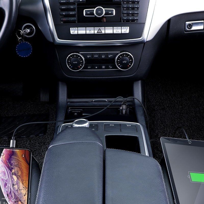 Intelligent car charger that adjusts power depending on the device being charged. Allows you to charge safely without worrying about damaging your equipment. Allows you to charge two devices at the same time.
