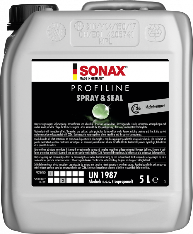 SONAX PROFILINE Spray & Seal, Krāsas pārklājums. Viegli izmantojams, transportlīdzekli var noturēt, aizsargāt un padarīt netīrumu atgrūdošu dažu minūšu laikā automašīnas mazgāšanas laikā! Izsmidziniet uz šampūna vai pēc tam, noskalojiet un pārklāšanas darbs ir paveikts! Krāsas virsmas krāsu dziļums tiek uzlabots un veidots spoguļa spīdums, īsā brīdī tiek radīts lielisks ūdens un netīrumu atgrūdošs efekts! Ir arī ideāli piemērots jau aizsargātiem krāsojumiem, lai atsvaidzinātu ūdeni atgrūdošo efektu. 5L.