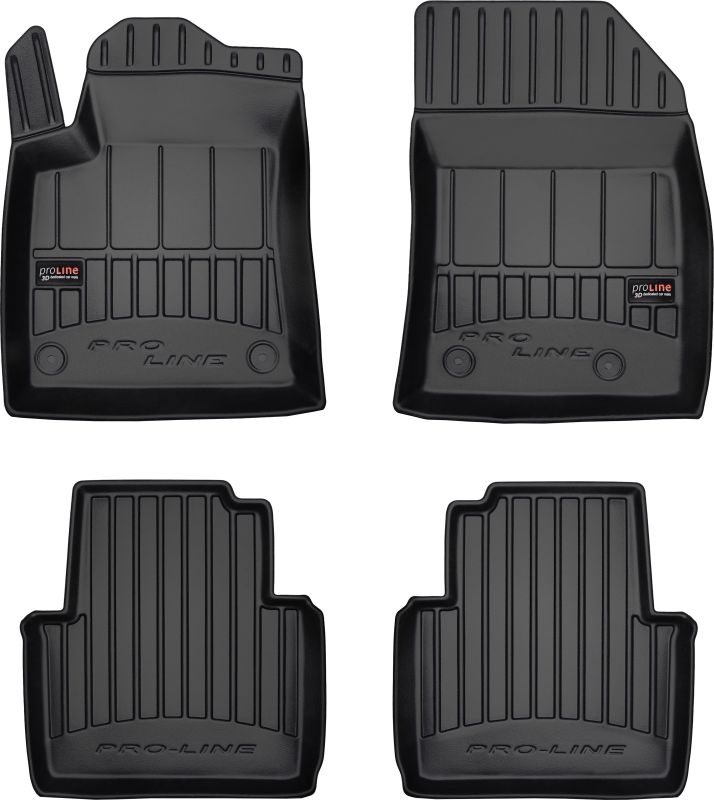 ProLine 3D rubber mats. High-quality plastic, rubber compound TPE, black, edge height 7 cm, mounting method – clamps. Perfect fit thanks to innovative 3D scanning technology. Additional edge protection – height 7 cm, always a clean car. Extremely durable material with a unique non-slip structure that is resistant to dirt. Excellent stability thanks to clamps – easy to install with one click. Protection for the footwell – comfort that allows the driver to rest their feet.n3D ProLine high-quality rubber 3D rubber mat set helps keep the car clean. Modern and functional design and extra high edges ensure effective collection of water and dirt and prevent them from escaping. This ensures the cleanliness of the car interior. Made of high-quality rubber that does not contain toxic ingredients. Odorless. The 3D rubber mat set adheres perfectly and adheres well to the interior floor. The set of rubber 3D rubber mats remains flexible even with temperature changes. The special surface prevents the mats from slipping while driving, which significantly affects safety and driving comfort.