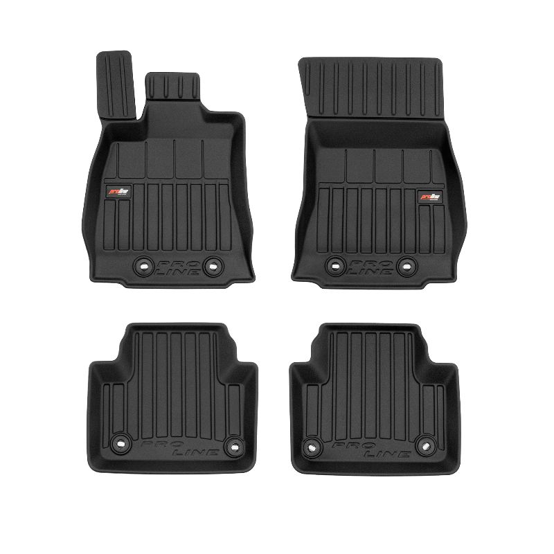 ProLine 3D rubber mats. High-quality plastic, rubber compound TPE, black, edge height 7 cm, mounting method – clamps. Perfect fit thanks to innovative 3D scanning technology. Additional edge protection – height 7 cm, always a clean car. Extremely durable material with a unique non-slip structure that is resistant to dirt. Excellent stability thanks to clamps – easy to install with one click. Protection for the footwell – comfort that allows the driver to rest their feet.n3D ProLine high-quality rubber 3D rubber mat set helps keep the car clean. Modern and functional design and extra high edges ensure effective collection of water and dirt and prevent them from escaping. This ensures the cleanliness of the car interior. Made of high-quality rubber that does not contain toxic ingredients. Odorless. The 3D rubber mat set adheres perfectly and adheres well to the interior floor. The set of rubber 3D rubber mats remains flexible even with temperature changes. The special surface prevents the mats from slipping while driving, which significantly affects safety and driving comfort.