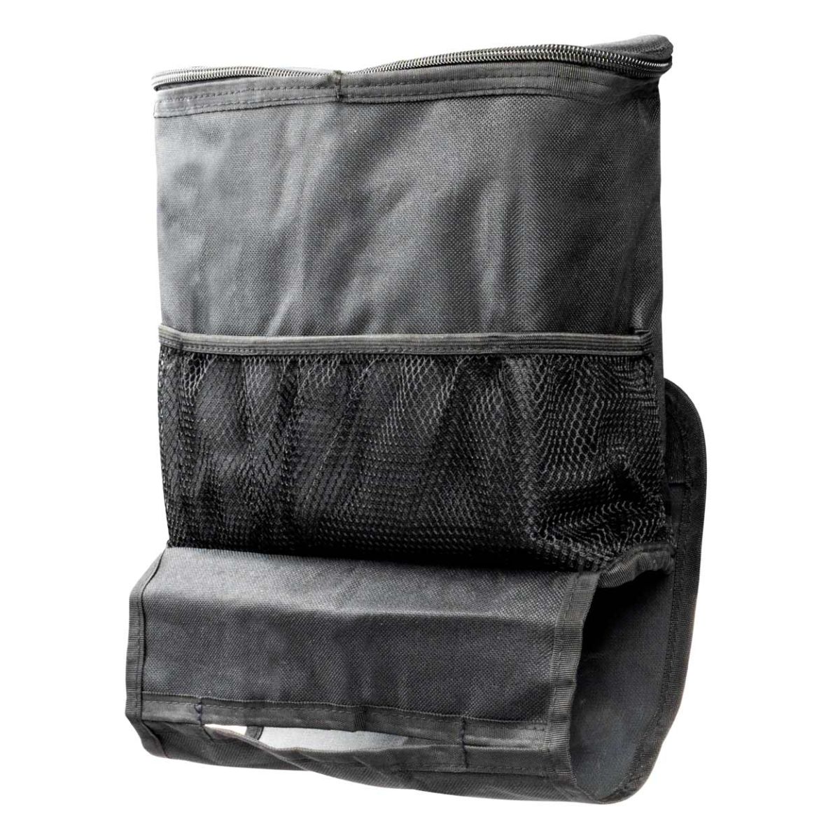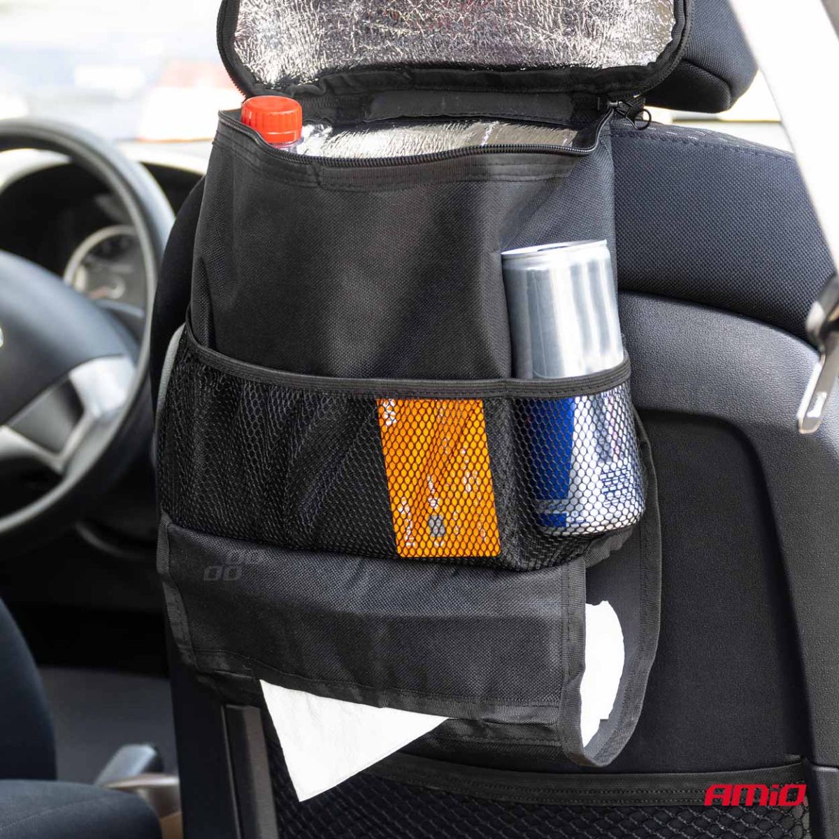 Thermal bag closed with a double zipper. Fastening to the headrest with a strap with a snap, which can also be used as a bag handle.
