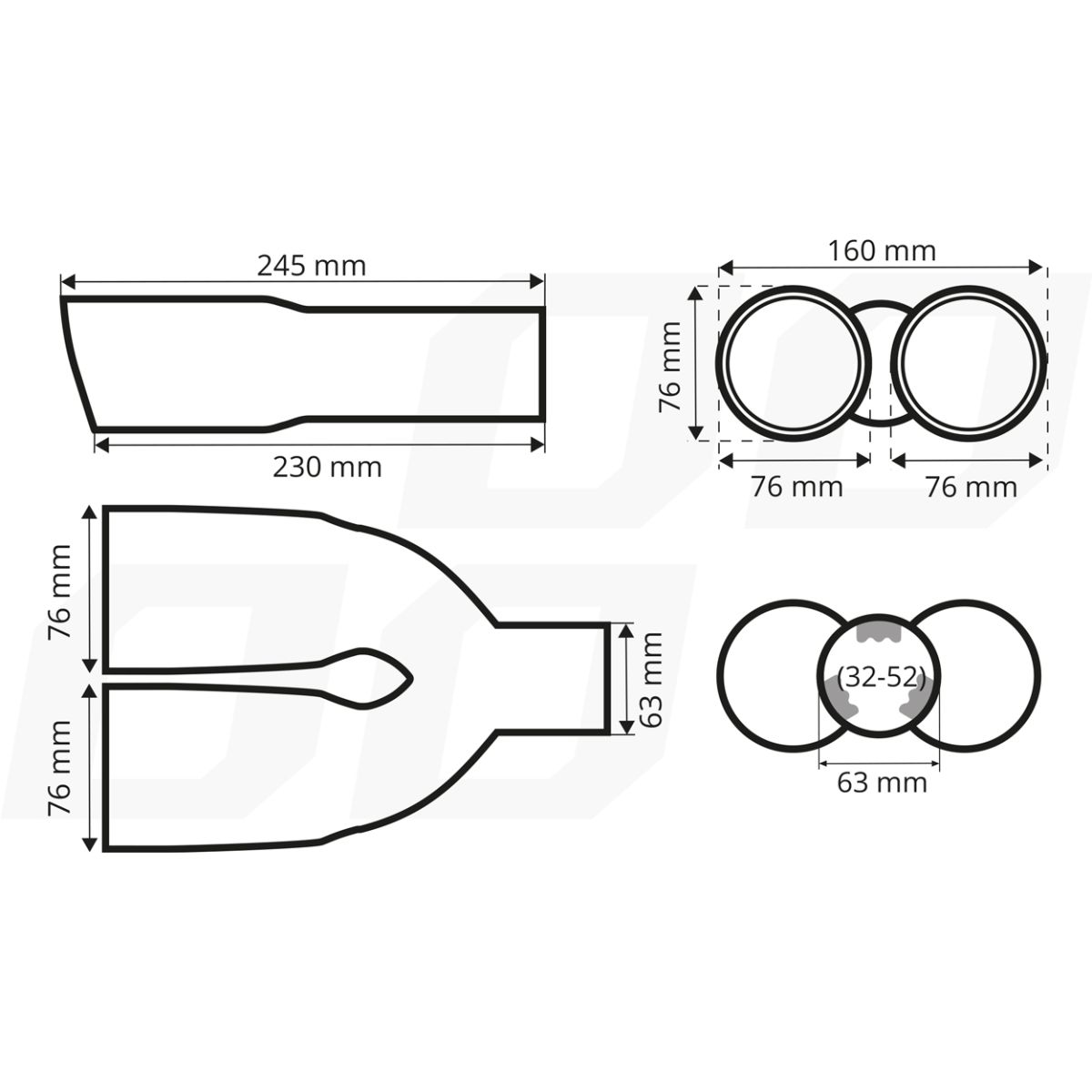 Universal tip for an elegant sporty look. Thanks to a wide range of bracket adjustments, it fits most cars (two mounting options: screw-on or weld-on).