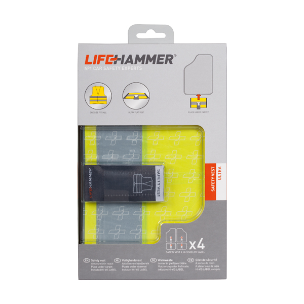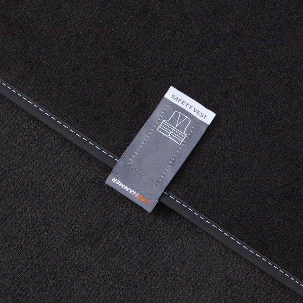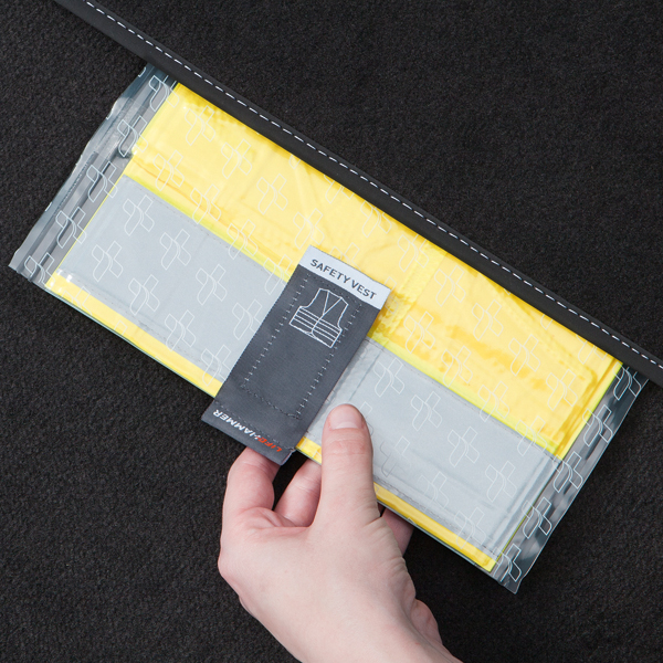 Pateicoties unikālajai birkai, ir skaidrs, ka zem grīdas paklāja ir drošības veste. Ārkārtas situācijā drošības vesti var ātri un viegli paņemt no grīdas paklāja, pavelkot etiķeti. Atveriet vakuuma iepakojumu, uzvelciet drošības vesti un atstājiet automašīnu redzams un galvenais drošībā.