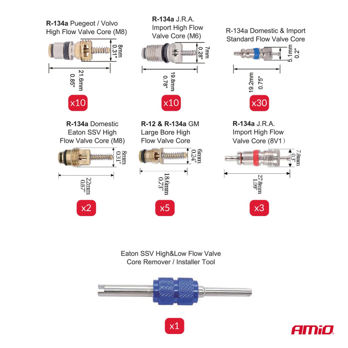A professional set of air conditioning valves, containing 61 components necessary for servicing and repairing air conditioning systems in vehicles and refrigeration equipment. The set enables quick and precise replacement of valves in air conditioning systems, ensuring tightness and proper operation of the installation.
