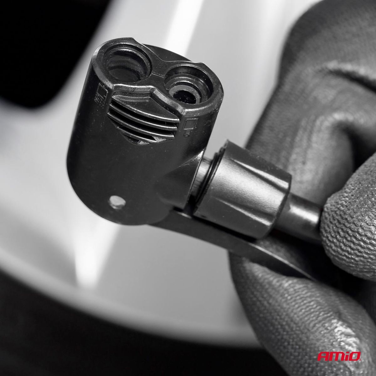 It has a double universal head for car and bicycle valves. Additionally, an adapter and needle for pumping mattress, balls, inflatable toys etc. are included.