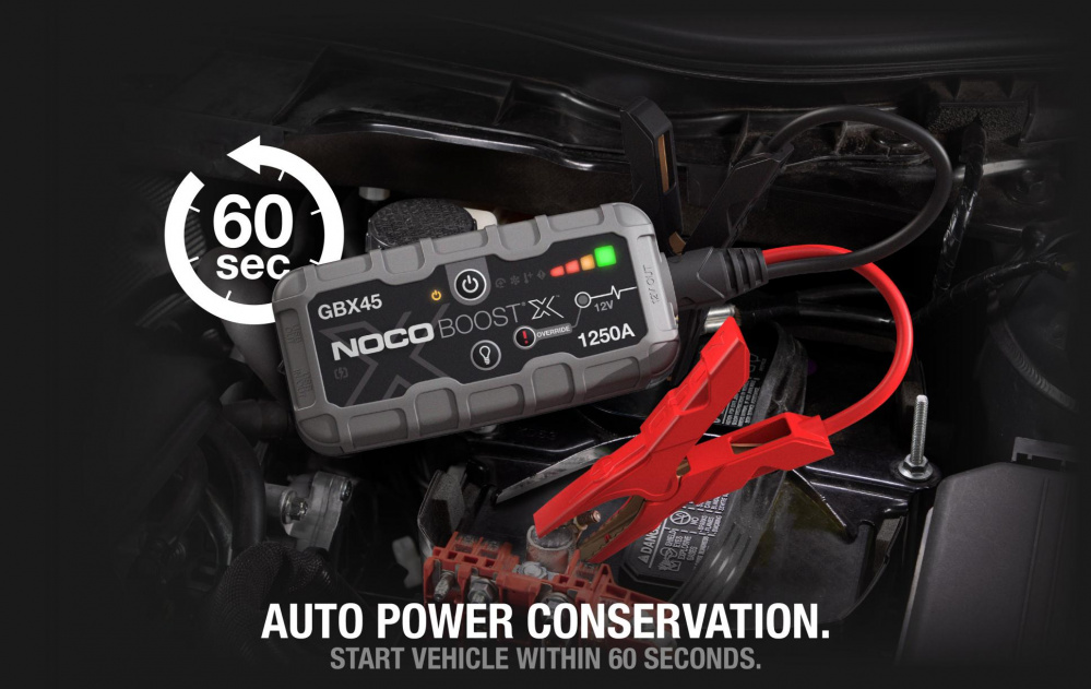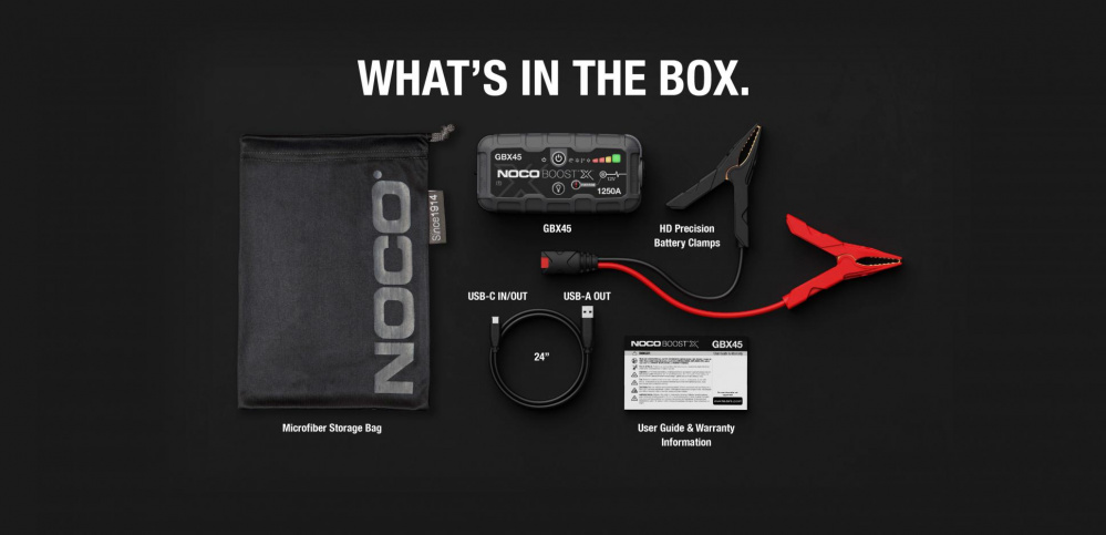 NOCO Boost X GBX45 ir pārnēsājams litija palaišanas starteris 12 voltu akumulatoriem transportlīdzekļos līdz 6,5 litru benzīnam un 4,0 litru dīzeļdzinējiem, ieskaitot automašīnas, motociklus, kravas automašīnas, visurgājējus, laivas, RV, furgonus, apvidus auto, traktorus un vairāk.
