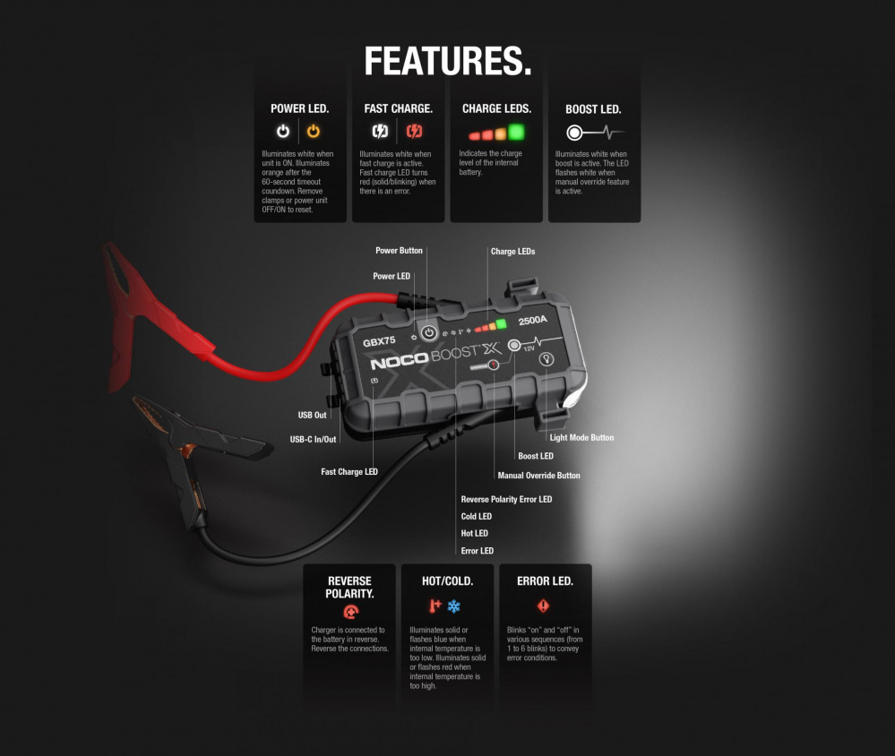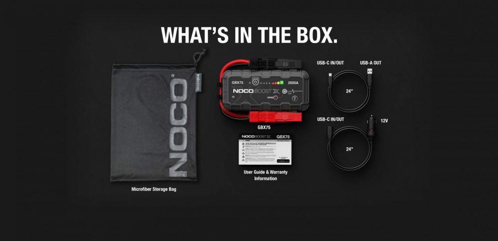 Saderība – NOCO GBX75 ir viens no daudzpusīgākajiem lēcienu starteriem ar 2500 amp starta jaudu. Tas ir viena no daudzfunkcionālajām palaišanas ierīcēm tirgū. Piemērota visa veida transportlīdzekliem, ieskaitot automašīnas, motociklus, kravas automašīnas, visurgājējus, laivas, visurgājējus, mikroautobusus, apvidus auto, traktorus un citus līdz 8,5 litru benzīna un 6,5 litru dīzeļdzinējiem.
