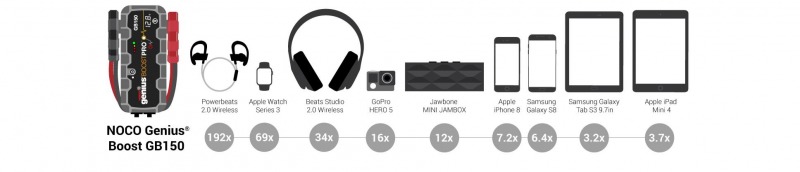 GB150 ir kompakts, bet jaudīgs litija jonu lēciena starteris 12 voltu akumulatoriem. Izmantojot to, jūs varat droši iedarbināt mirušu akumulatoru dažu sekunžu laikā - līdz 80 reizēm ar vienu uzlādi. Tas ir drošs pret kļūdām, padarot to drošu lietošanai ikvienam, un tajā ir dzirksteļizturīga tehnoloģija, kā arī pretēja polaritātes aizsardzība. GB150 litija lēciena starteris ir integrēts ar augstas jaudas 500 lumenu LED lukturīti ar septiņiem gaismas režīmiem, tas uzlādējas līdz vienam gadam un tam ir USB akumulatora komplekts personālo ierīču uzlādēšanai, atrodoties ceļā - līdz pat 12 viedtālruņu uzlādēšanai. GB150 ir raksturīga ātras uzlādes tehnoloģija, kas uzlādējas nedaudz vairāk kā trīs (3) stundās, kā arī 12 voltu papildu ports riepu sūkņu, invertoru, gaismu u.c. darbināšanai. Jauda ir 4000 ampēriem un ir piemērots lietošanai ar benzīna un dīzeļdzinējiem līdz 10 litriem un vairāk, piemēram, automašīnai, laivai, kravas automašīnai, pikapam ar dīzeļdzinēju, traktoram un citam. Ietver GB150, HD akumulatora skavas, USB lādēšanas kabeli, XGC spraudni ar spraudni, XGC sieviešu spraudni, XGC kabeli un mikrošķiedras uzglabāšanas maisiņu.