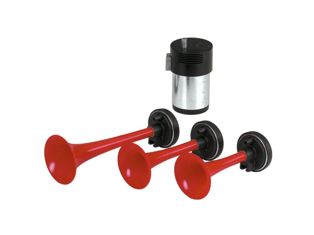 Skaņas signāli divi gabali + relejs komplektā. Signāltaure ar CE un e-sertifikāciju. Trīs toņi - augstais, vidējais un zemais. Komplektā divas taures, kompresors, relejs un nepieciešamie stiprinājumi.