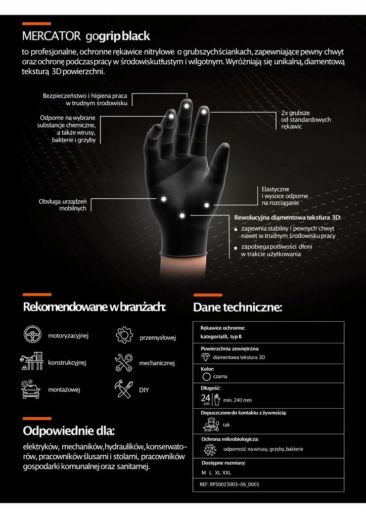 MERCATOR gogrip black Rękawice premium dla profesjonalistów! Gdy szukasz nitrylowej rękawicy premium do pracy w trudnym środowisku, gdy liczy się pewny chwyt i precyzja, a swoboda ruchów nie jest niczym ograniczona, jeśli ważna jest dla Ciebie odporność na wirusy, grzyby i bakterie – nitrylowa rękawica MERCATOR gogrip black jest stworzona z myślą o Tobie. Rękawice do zadań specjalnych Wyjątkowo elastyczne MERCATOR gogrip są 2 razy grubsze od standardowych rękawiczek dostępnych na rynku. Te wykonane z trwałego nitrylu rękawice, cechują się unikalną diamentową teksturą 3D, która sprawia, że Twój chwyt jest mocny i stabilny a równocześnie nie ogranicza Twojej precyzji. Oryginalna struktura MERCATOR gogrip sprawi, że możesz obsługiwać urządzenia mobilne bez zdejmowania rękawiczek. Dodatkowo zrewolucjonizowana diamentowa tekstura 3D zapobiega potliwości dłoni w trakcie użytkowania, co podwyższa komfort pracy, minimalizując ryzyko uszkodzeń skóry dłoni. Jedna rękawica wiele zastosowań! Polecane przede wszystkim w branżach motoryzacyjnej, konstrukcyjnej, montażowej, przemysłowej – wszędzie tam, gdzie Twoja dłoń potrzebuje ochrony przed zabrudzeniem i narażona jest na kontakt z substancjami chemicznymi takimi jak oleje lub smary. Wysoka jakość środków ochrony indywidualnej potwierdzona jest klasyfikacją rękawic jako kategoria III, typ B. Poddajemy nasze rękawice szczegółowym testom, by zapewnić Ci bezpieczeństwo i zabezpieczenie przeciw grzybom, bakteriom i wirusom. Elastyczność i wysoka odporność na rozciąganie pozwalają zmieniejszyć ilość zużytych rękawic – dzięki temu Ty dbasz o środowisko. Zapewnij swoim dłoniom ochronę w klasie premium – wybierz MERCATOR gogrip! MERCATOR gogrip black to: - Łatwe zakładanie rękawic i pewny chwyt dzięki specjalnej diamentowej teksturze – także w środowisku tłustym i mokrym; - Ochrona przed substancjami chemicznymi; - Barierowa dla bakterii, wirusów i grzybów; - Pozwalają na obsługę urządzeń dotykowych; - 2 x grubsza niż standardowa rękawica nitrylowa; - Elastyczne i wysoce odporne na rozciąganie; - Wysoka wytrzymałość oraz jakość rękawic. Typ produktu: środek ochrony indywidualnej Klasa Ochrony (PPE) III typ B Marka MERCATOR Materiał nitryl Tekstura diamentowa tekstura Powierzchnia wewnętrzna bezpudrowa Kształt uniwersalny (oburęczny, pasujący na obie dłonie) Mankiet rolowany Długość rękawicy profesjonalnej i gospodarczej standardowa (240 mm) Grubość rękawice grubsze Szczególnie polecane do: Mechanika samochodowa Prace warsztatowe Prace konstrukcyjne i montażowe – branże motoryzacyjna, przemysłowa, mechaniczna i budowlana. Elektryka, hydraulika, konserwacja, ślusarnie i stolarnie, gospodarka komunalna, sekcja techniczno-eksploatacyjnej oraz sekcja sanitarna. Branża spożywcza. Utrzymanie czystości. Majsterkowanie (DIY).
