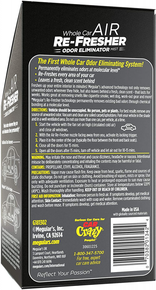 Meguiar's Whole Car Air Re-Fresher iekļūst visā interjerā, pārvietojoties pa ventilācijas sistēmu, virs galvas un starp visām citām sarežģītām auto vietām. Meguiar's Re-Fresher tehnoloģija neatgriezeniski novērš esošo slikto smaku, izmantojot ķīmisku savienojumu molekulārā līmenī, kā piemēram cigaretes, dzīvnieku smakas utt.