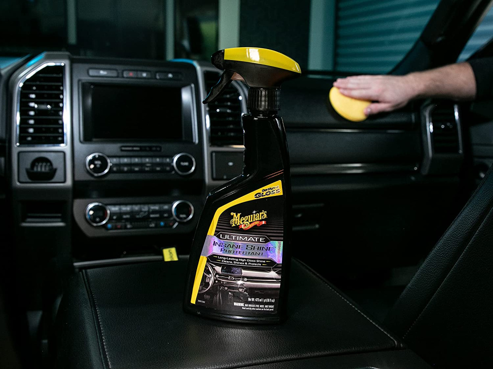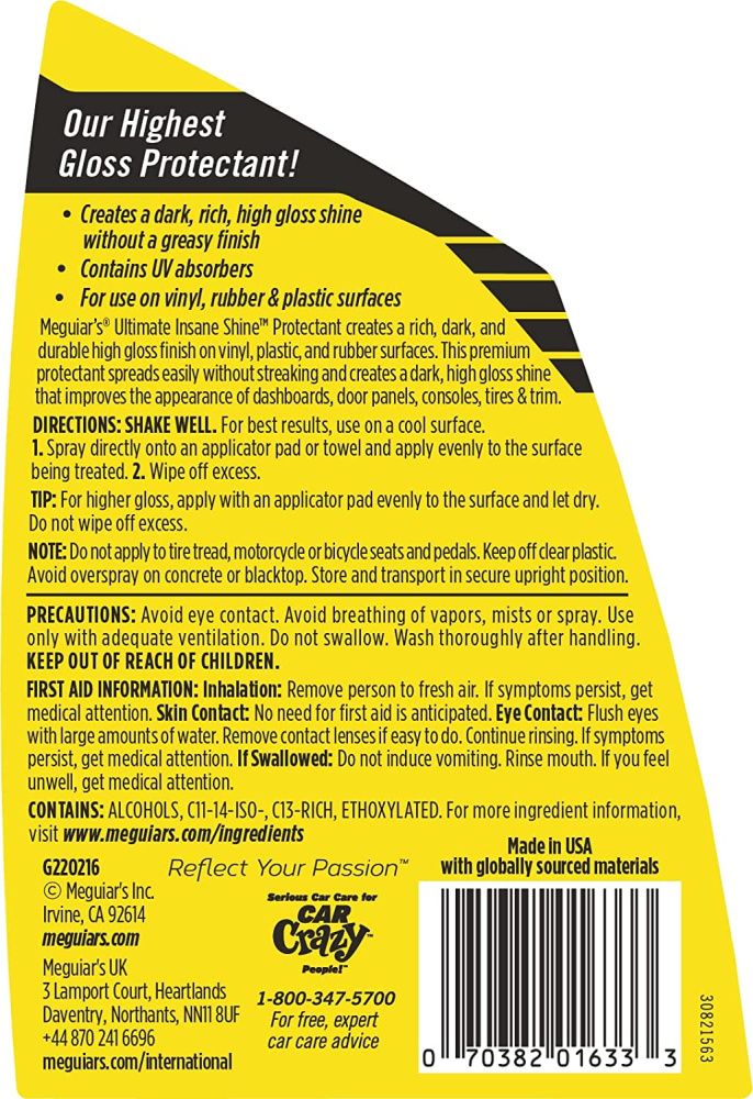 Meguiar's Ultimate Insane Shine Protectant rada bagātīgu, tumšu un noturīgu spīdumu nekrāsotām vinila, plastmasas un gumijas virsmām. Šis augstākās kvalitātes aizsarglīdzeklis viegli klājas, neveidojot svītras, un rada tumšu, spīdumu, kas uzlabo tādu virsmu izskatu kā salona paneļu, durvju paneļu, konsoles, riepas,un ārējā apdari.