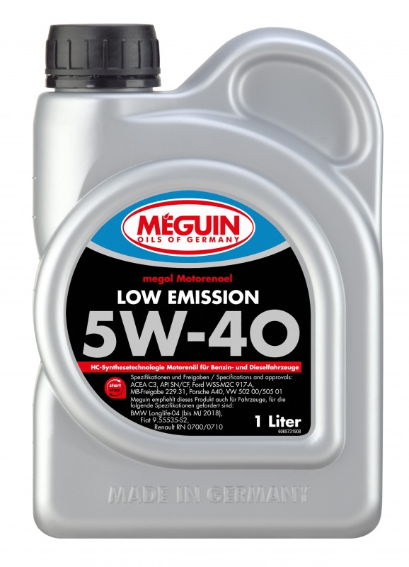 Meguin Low Emission - SAE 5W-40 - аugtas efektivitātes motoreļļa, kas izgatavota, izmantojot unikālo Low SAPS (neliela sulfāta pelnu, fosfora un sēra daudzuma) piedevu tehnoloģiju un HC sintēzes (hidrokrekings) tehnoloģiju.