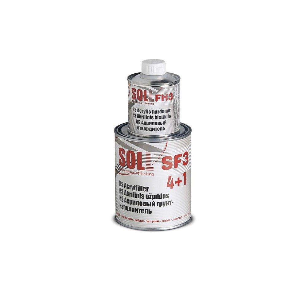 SOLL SF3 HS 4:1 ir augstas kvalitātes, ātri žūstoša akrila špaktele ar lieliskām aizpildīšanas īpašībām. To ir viegli slīpēt un tā nodrošina gludu, līdzenu virsmu. Šī divkomponentu špaktele ir ideāli piemērota lietošanai uz dažādām virsmām, tostarp dzelzs, tērauda, alumīnija un cinkotām virsmām. Pirms šīs špakteles uzklāšanas ir svarīgi izmantot skābu grunti uz metāla virsmām. Nav piemērota termoplastiskām virsmām.