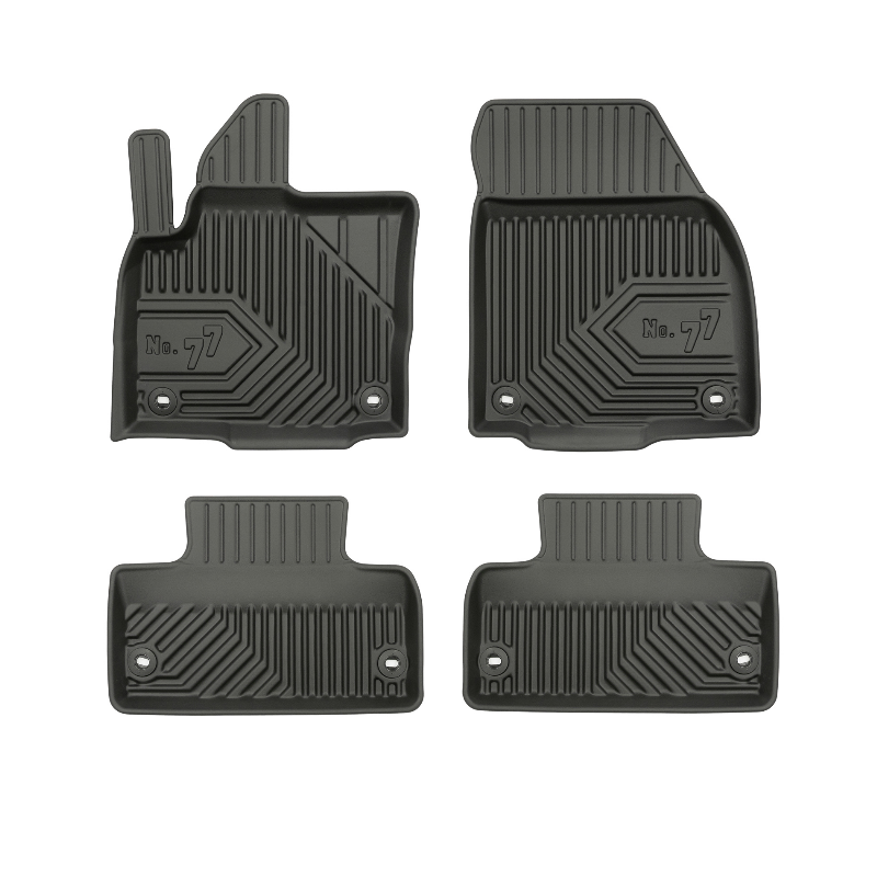 Gumijas paklājiņi Premium 77: (augstas kvalitātes plastmasa, gumijas maisījums / TPE, komplekts - 4 gab., melni, malas augstums 4 cm, uzstādīšanas metode - klipši).AUTO PAKLĀJIŅI FROGUM 77 PREMIUM. Ideāla piegulšana, pateicoties inovatīvai 3D skenēšanas tehnoloģijai, Malas augstums - 4 cm nodrošina lielāku aizsardzību pret netīrumiem, Moderns un funkcionāls dizains, kas notur netīrumus paklājiņa iekšpusē, Neslīdošas speciālas klipši, viegli uzstādāmi, Īpaša aizsardzība, kas ļauj nolaist vadītāja kāju. Augsta līmeņa aizsardzība jūsu automašīnai, paklājiņi lieliski pieguļ un perfekti pieguļ salona grīdai. Moderns un funkcionāls dizains, kā arī augsta mala garantē efektīvu ūdens un netīrumu savākšanu un novērš to noplūdi. Tas uztur automašīnas salonu tīru. Izgatavoti no augstas kvalitātes gumijas, kas nesatur toksiskas sastāvdaļas. Bez smaržas. Paklājiņiem ir klipši, tāpēc tos ir viegli piestiprināt pie grīdas. Gumijas paklājiņi saglabā savu elastību pat pie temperatūras izmaiņām. Īpašā virsma neļauj paklājiņiem slīdēt braukšanas laikā, kas ievērojami ietekmē brauciena drošību un komfortu.