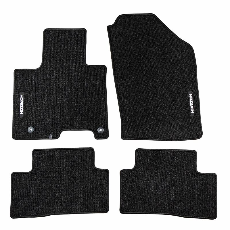 ELEGANTS INTERJERS. Premium klases HORIZON paklāji izceļas ar savu stilīgo un moderno izskatu, kas perfekti uzsver automašīnas interjera eleganci. To estētiskais dizains ļauj tiem nevainojami iekļauties jebkura veida interjerā un piešķirt tam ekskluzivitāti. AUGSTS KOMFORTA LĪMENIS. Pateicoties cilpu plūksnu struktūrai un svaram 535 g/m², HORIZON paklāji ir ne tikai izturīgi, bet arī mīksti un patīkami uz tausti. Tas nodrošina izcilu komfortu katrā braucienā un palielina automašīnas ikdienas lietošanas ērtības. Viegli kopjams HORIZON ir ārkārtīgi praktisks produkts, ko var ātri uzstādīt un viegli kopjams, kas to padara vēl pievilcīgāku. Izturība un aizsardzība HORIZON paklājs nodrošina ilgtermiņa aizsardzību jūsu automašīnas salonam, efektīvi aizsargājot grīdu no netīrumiem un bojājumiem. Tā izturīgā konstrukcija un augstas kvalitātes materiāli nodrošina, ka tas kalpos jums ilgu laiku, nsaglabājot savu pievilcīgo izskatu. Paklāja granulētais gumijas pamatne nodrošina izcilu saķeri un novērš slīdēšanas risku braukšanas laikā. Polipropilēna diegu izšūšana.nMateriāls – samts.