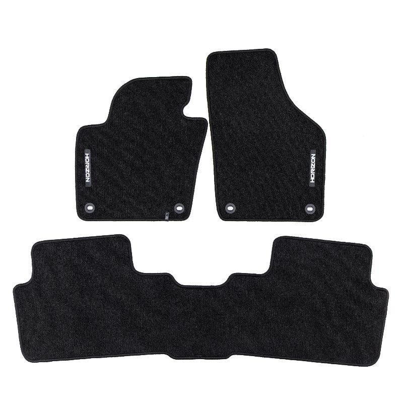 ELEGANTS INTERJERS. Premium klases HORIZON paklāji izceļas ar savu stilīgo un moderno izskatu, kas perfekti uzsver automašīnas interjera eleganci. To estētiskais dizains ļauj tiem nevainojami iekļauties jebkura veida interjerā un piešķirt tam ekskluzivitāti. AUGSTS KOMFORTA LĪMENIS. Pateicoties cilpu plūksnu struktūrai un svaram 535 g/m², HORIZON paklāji ir ne tikai izturīgi, bet arī mīksti un patīkami uz tausti. Tas nodrošina izcilu komfortu katrā braucienā un palielina automašīnas ikdienas lietošanas ērtības. Viegli kopjams HORIZON ir ārkārtīgi praktisks produkts, ko var ātri uzstādīt un viegli kopjams, kas to padara vēl pievilcīgāku. Izturība un aizsardzība HORIZON paklājs nodrošina ilgtermiņa aizsardzību jūsu automašīnas salonam, efektīvi aizsargājot grīdu no netīrumiem un bojājumiem. Tā izturīgā konstrukcija un augstas kvalitātes materiāli nodrošina, ka tas kalpos jums ilgu laiku, nsaglabājot savu pievilcīgo izskatu. Paklāja granulētais gumijas pamatne nodrošina izcilu saķeri un novērš slīdēšanas risku braukšanas laikā. Polipropilēna diegu izšūšana.nMateriāls – samts.