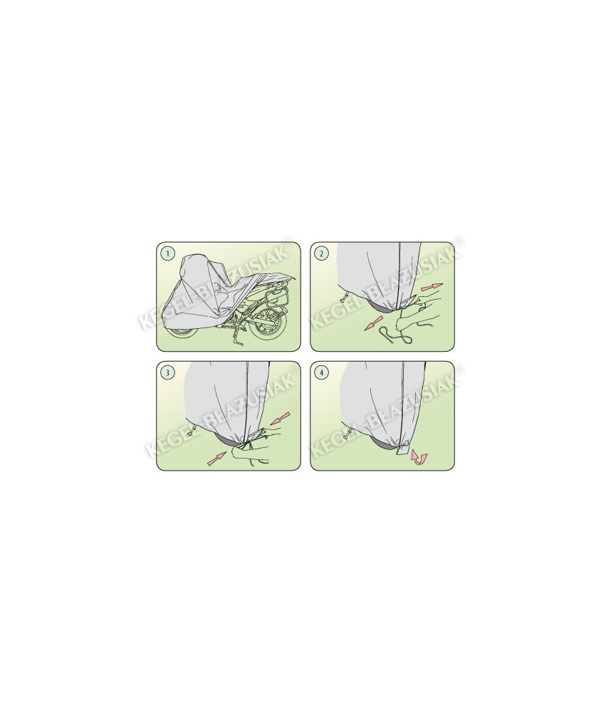 Montāža: Pārvalks jauzklāj uz tīra motocikla (nedrīgst būt virsū smiltis), pēc tam pēc iespējas cieši pievelciet pārsega iešūto šņori un sasieniet.
