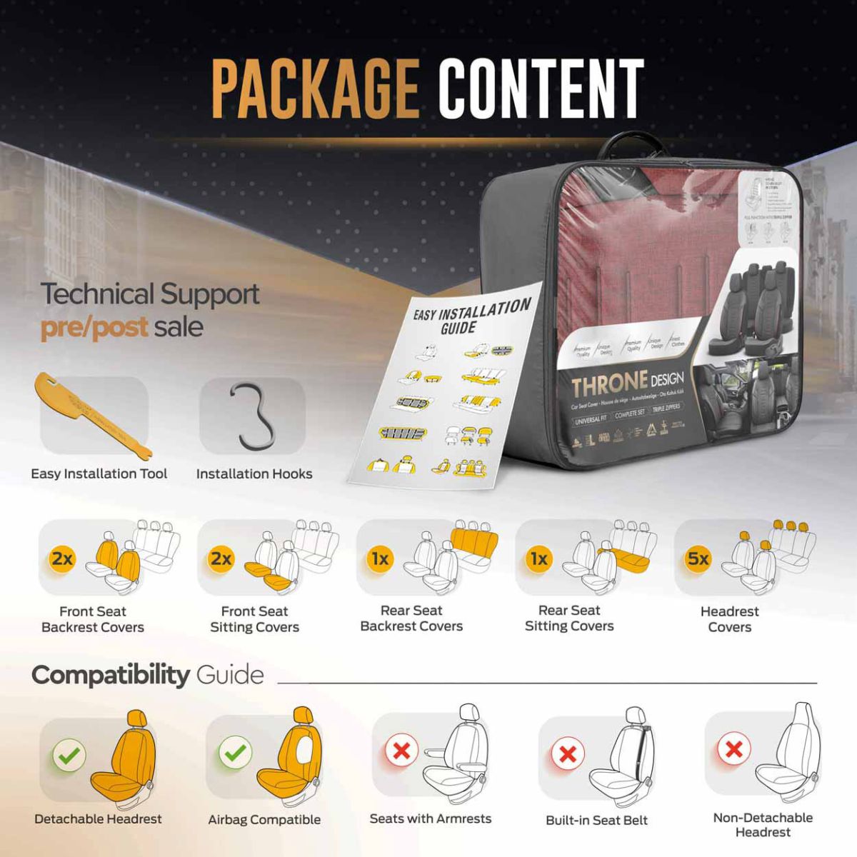 Pārvalkiem nav izgriezumu jostām vai aizmugurējiem galvas balstiem, jo tie ir paredzēti dažādiem automašīnu modeļiem. Pēc rūpīgas montāžas un montāžas jums pašiem jāizveido nepieciešamie caurumi.