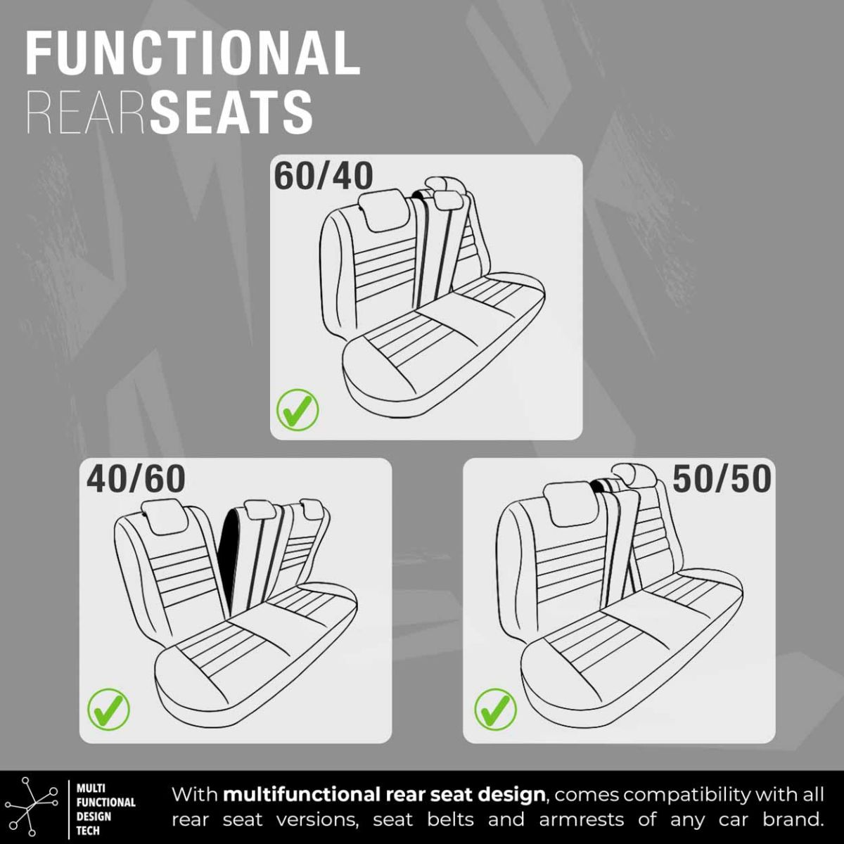 - Pārvalkiem aizmugurējā sēdeklī ir rāvējslēdzēji, tāpēc tie der lielākajai daļai tirgū pieejamo sēdekļu (nedalīti, labās un kreisās puses sadalītie sēdekļi). Atzveltnes varam viegli nolocīt, lai palielinātu bagāžas vietu.