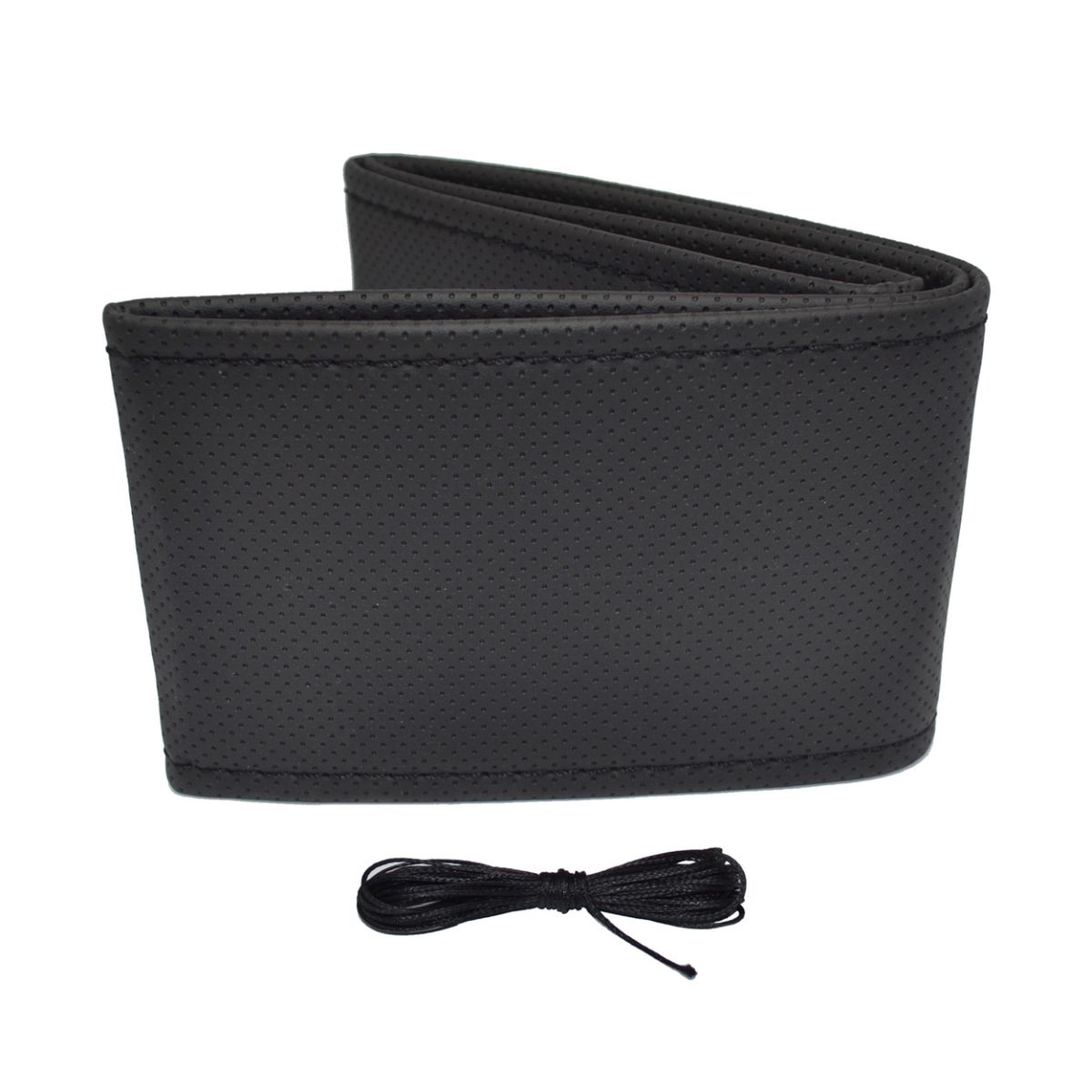 1. Uzlieciet pārsegu uz stūres tā, lai ādas šuve būtu stūres rata apakšā un vidū. Pārvalks ir nošūts no pleca līdz plecam Vispirms nomēriet komplektā iekļauto diegu. Tas ir aptuveni divas reizes garāks par šūšanas posmu, t.i., no pleca līdz plecam.