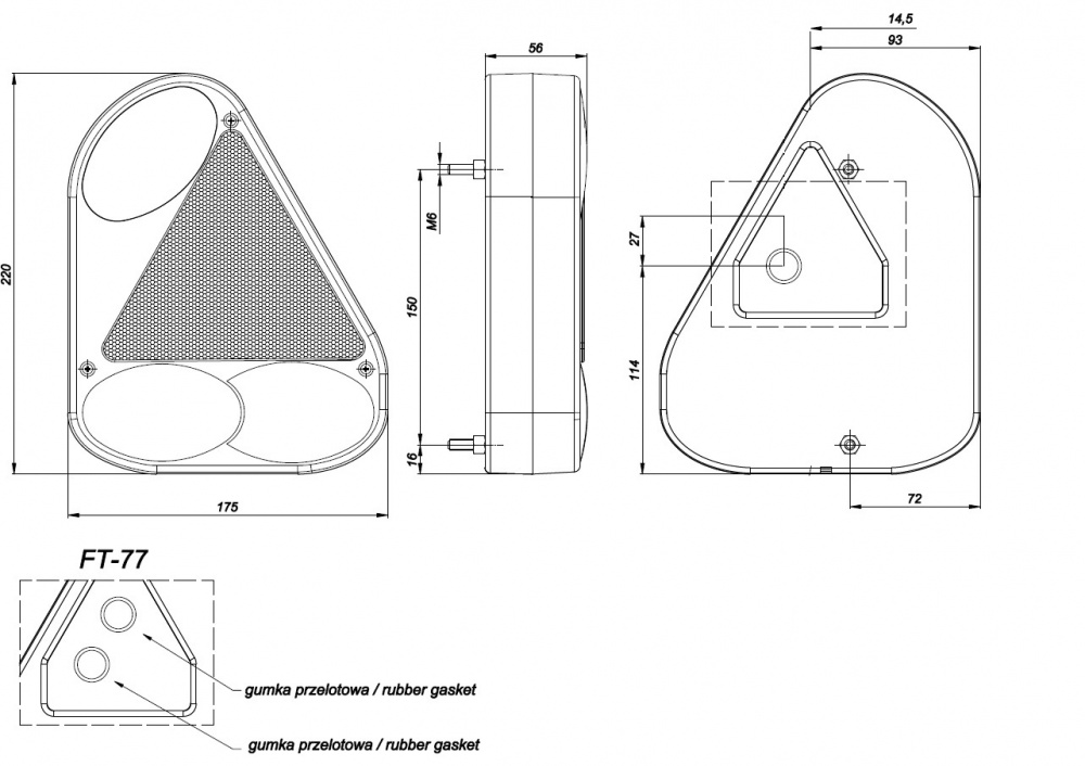 Labās puses trijstūrformas piekabes lukturis 12V FT-077 220-175mm