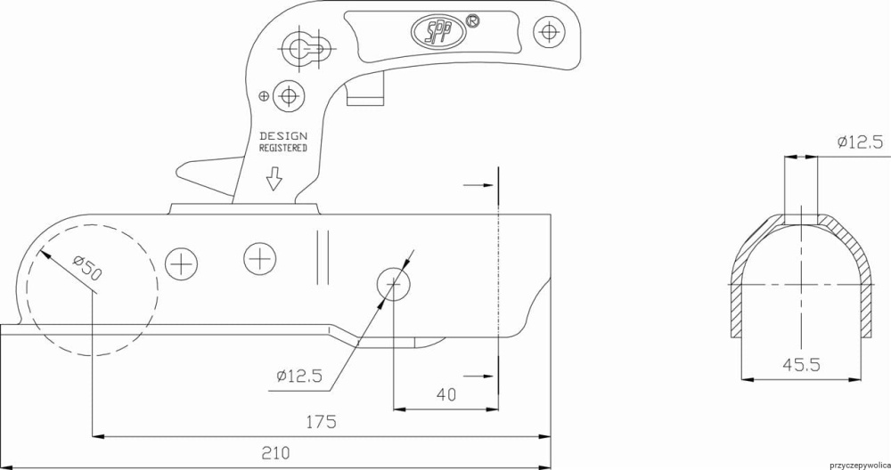 Piekabes sakabes mehānisms, apaļš stiprinājums Ø 45 mm. Paredzēts piekabēm ar pilnu masu līdz 1300 kg.
