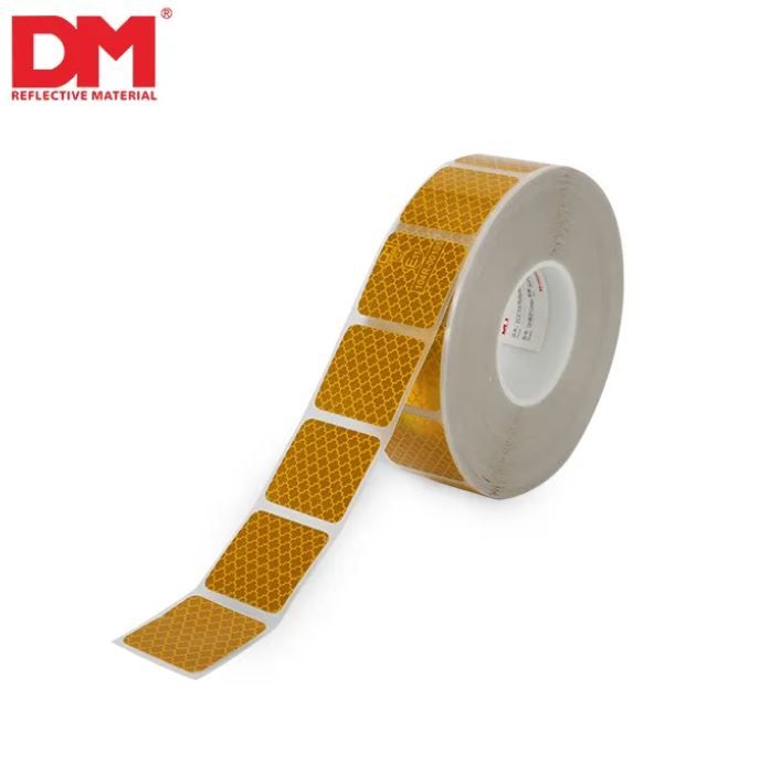 Dzeltena atstarojoša līmlenta, kas sagatavota 50x50mm atstarojošos kvadrātos. Pielietojums: Kravas automašīnas, piekabes, smagie un garie transportlīdzekļi utt.