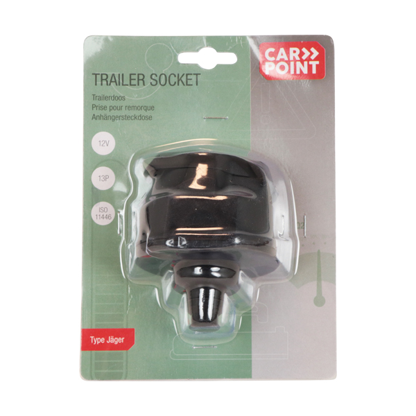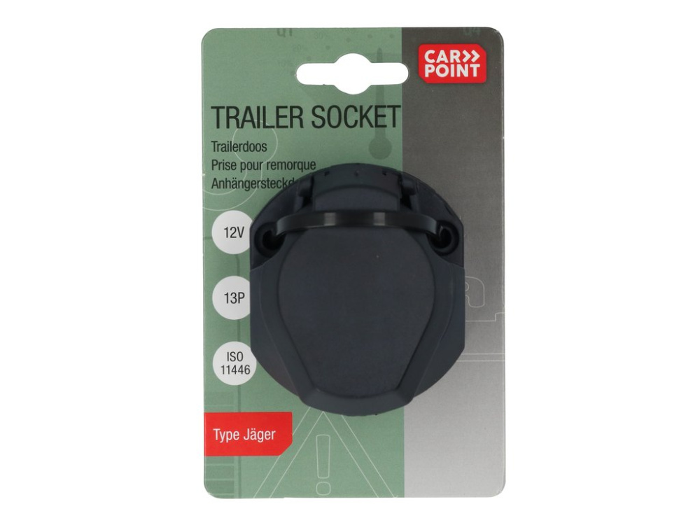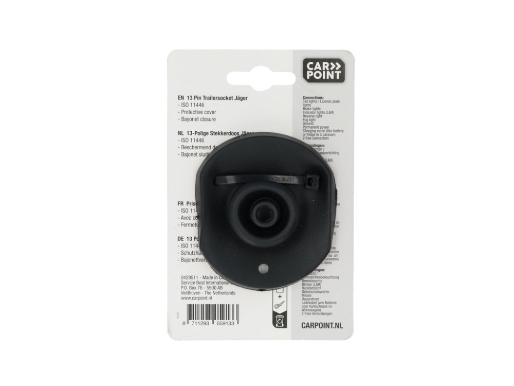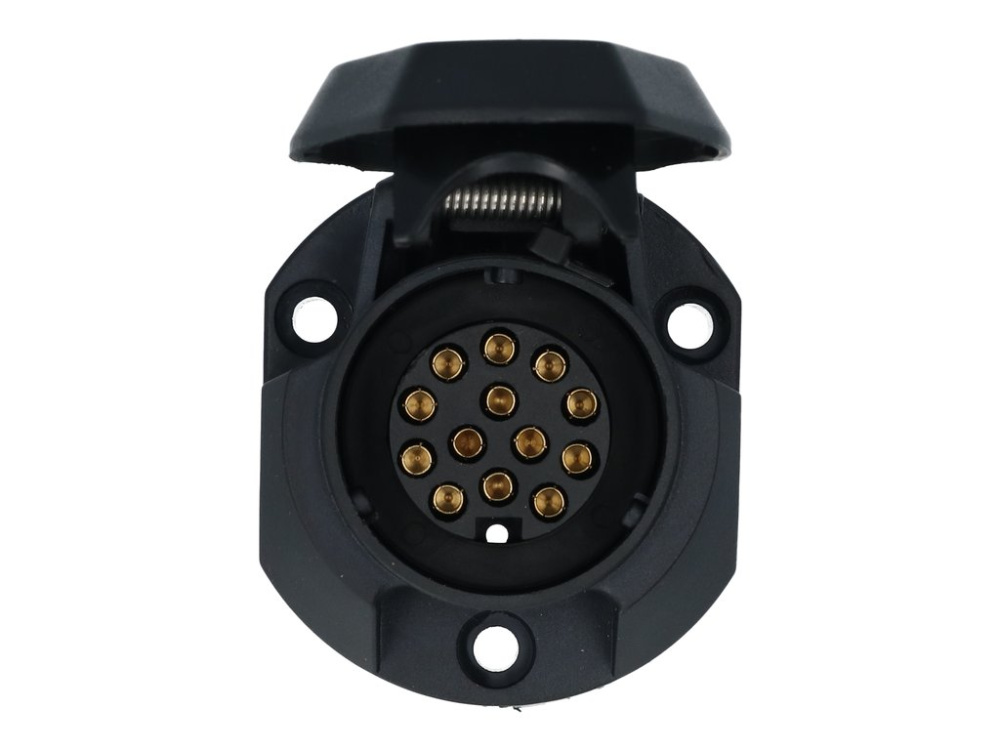 Piekabes plastmasas kontaktligzda 13poli ar blīvgumiju CARPOINT. Jäger ligzda automašīnai vai kemperam. Ar visām apgaismojuma pamatfunkcijām un papildu pieslēgumu atpakaļgaitas apgaismojumam, aizmugurējam miglas lukturim, pastāvīgai barošanai un ledusskapja komutācijas barošanai. Ar bajonetes aizdari.