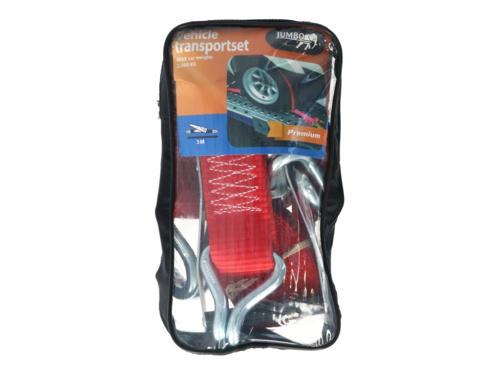 Šī pilnīgā Jumbo stiprinājuma siksna ir ideāls risinājums, lai droši pārvadātu automašīnu uz piekabes. Šis komplekts sastāv no 2 daļām, no kurām 1 gabals ir 45 cm ar cilpu abās pusēs, caur kurām jāliek otrs gabals. Tas stingri pievelk siksnu ap transportlīdzekļa riteni, lai transportlīdzekli varētu droši transportēt. Siksnai nav gredzenu, lai diski nevarētu tikt bojāti.