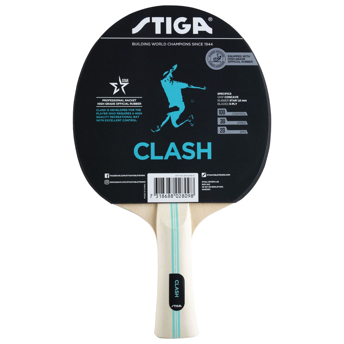 Zviedru firmas STIGA SportsAB galda tenisa rakete Hobby Clash.Radīta priekš spēlētāja, kurš pieprasa augstas kvalitātes raketi ar lieliskām bumbas kontroles īpašībām. Vairāk nekā 50 gadu pētījumu un uzlabojumu rezultāts. ROKTURIS: Concave; GUMIJA: STAR 1,6 mm; LĀPSTIŅA: 5-PLY. ĀTRUMS: 30; GRIEŠANA: 20; KONTROLE: 100