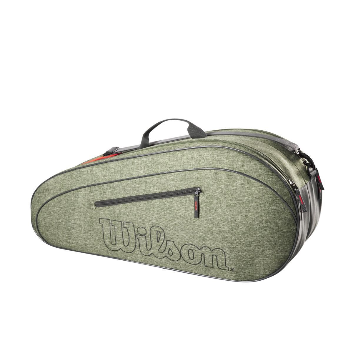Wilson Team 6 rakešu soma ir lieliski piemērota amatieru spēlētājiem, kuriem nepieciešama vieta vairākām tenisa raketēm, maiņas drēbēm un citiem piederumiem. Divos galvenajos nodalījumos var ievietot līdz sešām raketēm, kā arī liela ārējā kabata ar rāvējslēdzēju, kas lieliski piemērota papildu bumbiņu, gripu un uzkodu glabāšanai. Pārnēsājiet to izmantojot augšējos rokturus vai polsterētās plecu siksnas. *Izmēri: 76 x 24 x 33 cm; *Materiāli: 100% poliesters; *Rakešu ietilpība: līdz 6; *2 Galvenais nodalījums; *1 liela piederumu kabata; *1 maza piederumu kabata.