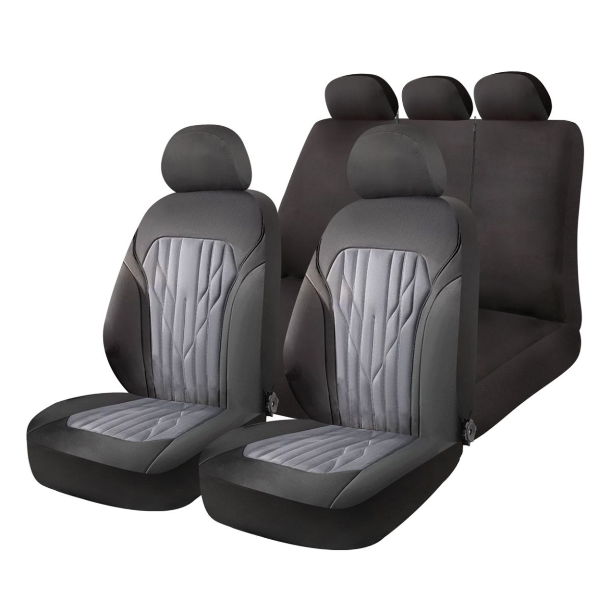 A complete set of car covers for the front and rear of a passenger vehicle. Made of durable material with high resistance to abrasion and dirt, with quilted inserts in grey and black. The covers are suitable for seats with airbags ndash; they do not block their operation. They have openings for headrests and seat belts. The rear parts of the covers are fully covered, which ensures protection of the entire front seats, aesthetic appearance and durability of use.