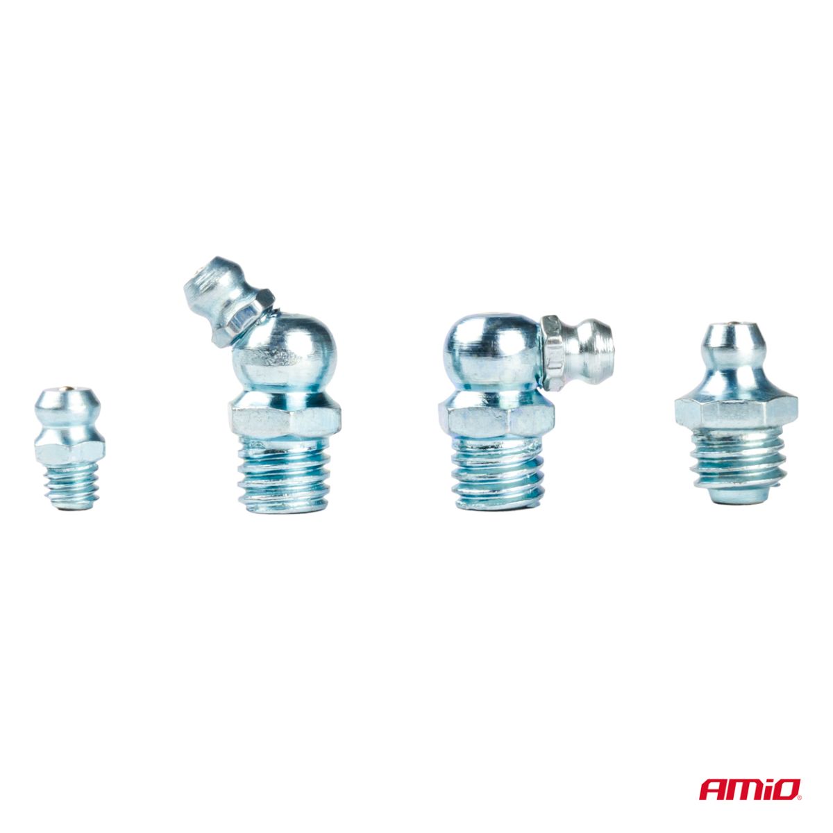 The set includes straight , 45 degree and 90 degree grease nipples with M6, M8, and M10 threads.