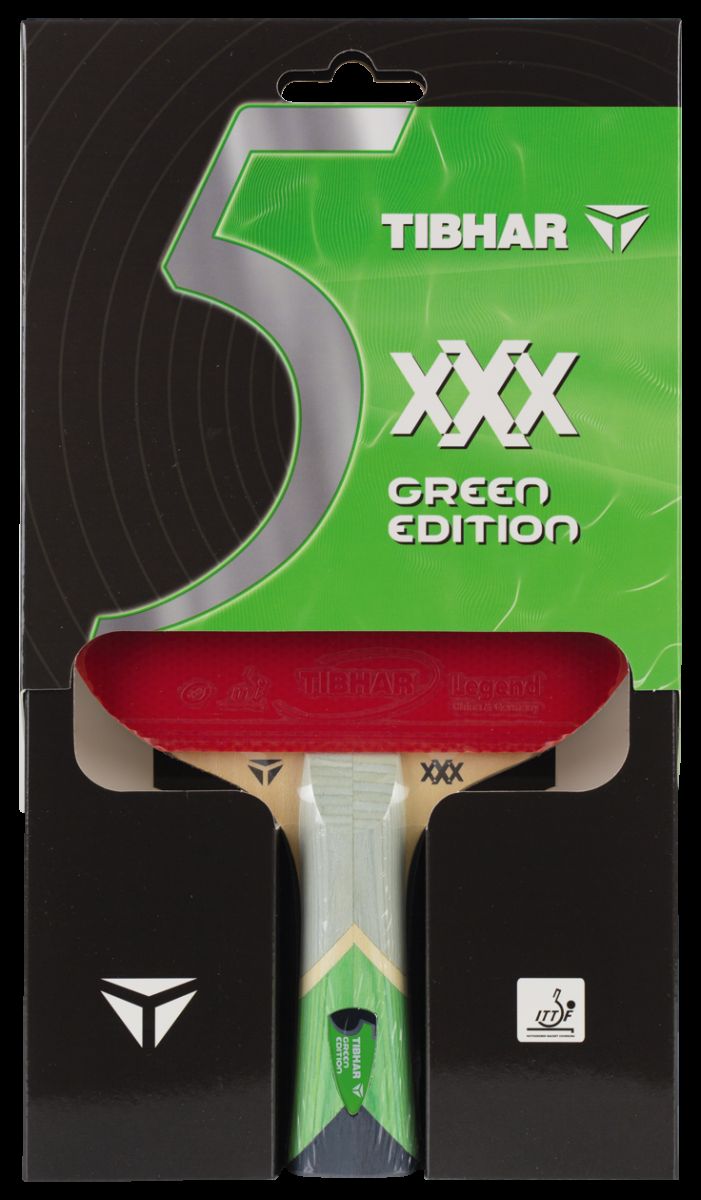 TIBHAR galda tenisa rakete XXX GREEN EDITION. Radīta priekš vidēja līmeņa spēlētājiem, kuri vēlās uzlabot un pilnveidot savu tehniku, kā arī tiem kuri vairāk orientēti uz griešanas tehniku un kontroli. Šo raketi ir viegli vadīt pateicoties lipīgā tipa Tibhar Legend 2,0 mm, ITTF apstiprinātajām gumijām, kuras piemērotas spēlei ar griešanu un nodrošina lielisku kontroli pie veiktiem sitieniem mērenā tempā. Koks: 5 | 5. līmenis: Ātrums: 80 | Rotācija: 80 | Kontrole: 70; Rokturis: Concave.