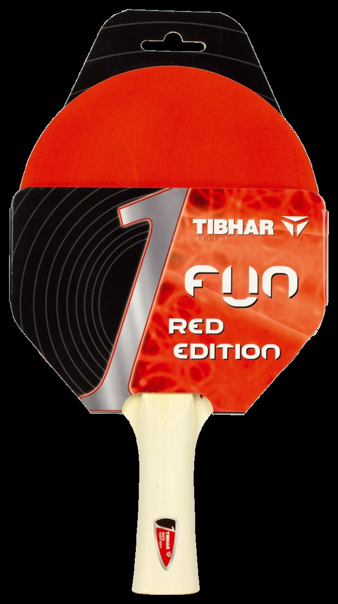TIBHAR galda tenisa rakete FUN RED EDITION. Radīta iesācējiem un hobija spēlētājiem vieglai spēlei bez apgūtas tehnikas un neregulārai lietošanai atpūtas zonās. Gumija: FUN 1,8 mm ideāli piemērotas lietošanai hobija sektorā. Koks: 5 | 1. līmenis: Ātrums: 30 | Rotācija: 30 | Kontrole: 95; Rokturis: Concave | Svars: apm. 180 g. Gumija: FUN 1,8 mm, sarkana un melna.