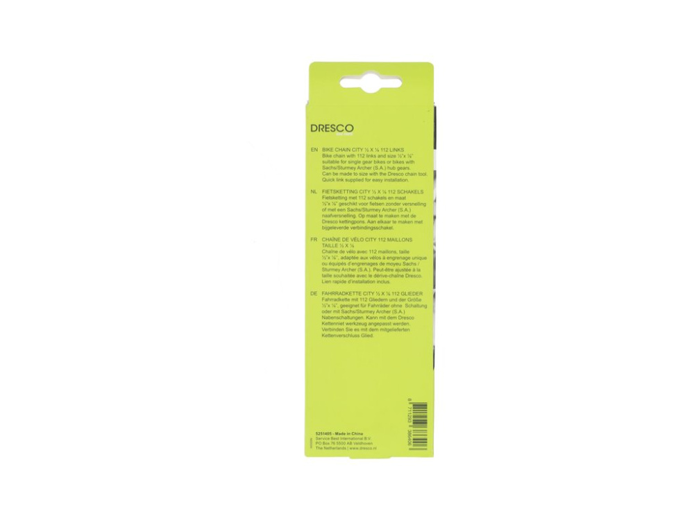 Dresco velosipēdu ķēde, kas piemērota pilsētas velosipēdiem vai bērnu velosipēdiem bez pārnesumiem. Ķēdei ir 112 ķēdes posmi, un tās izmērs ir 1/2" X 1/8".